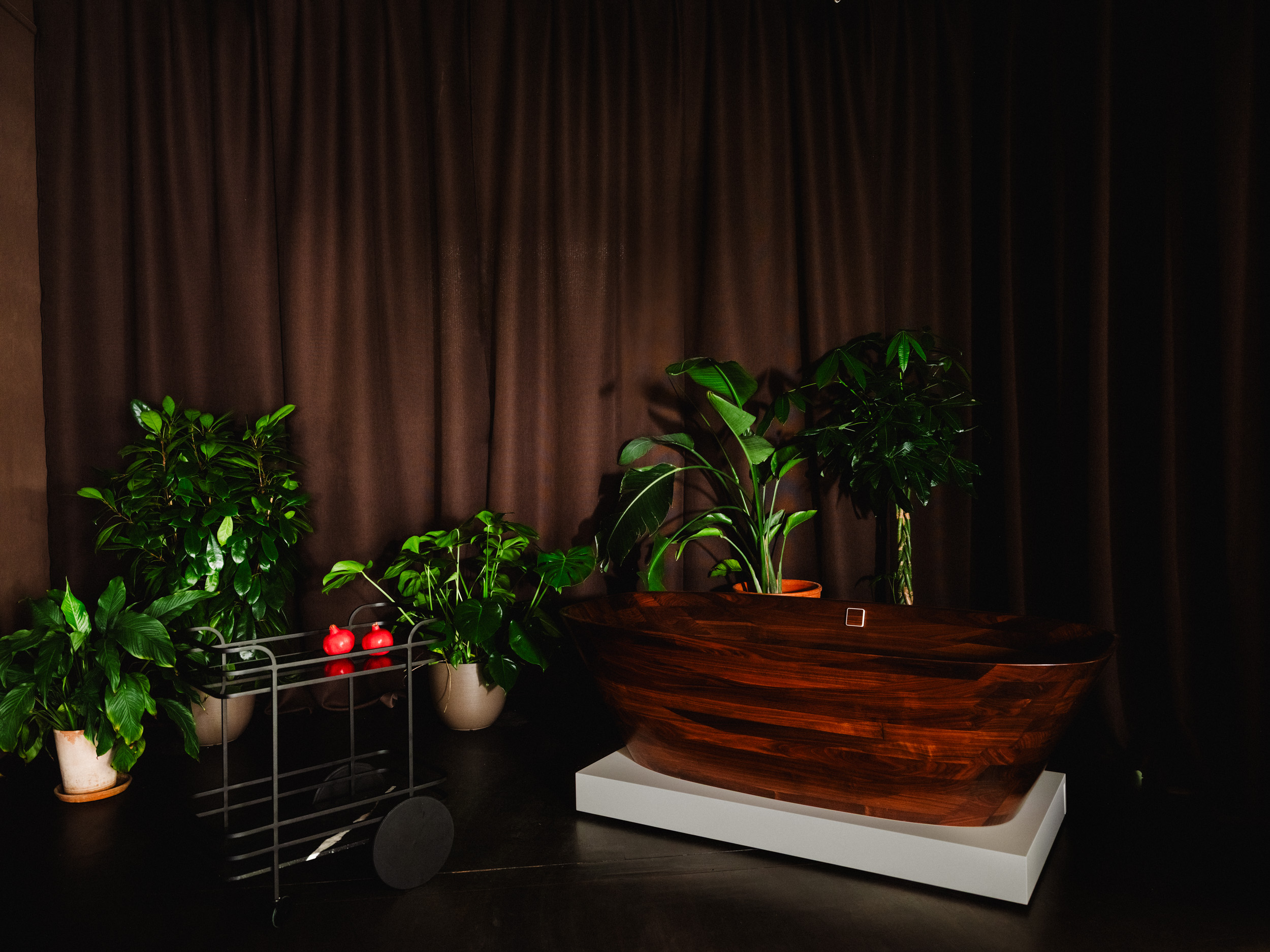 Die Ausstellungsstücke verdeutlichen Nina Mairs experimentellen Ansatz und ihren Forscher:innendrang bei der Verwendung von unterschiedlichen Naturmaterialien. Zu sehen sind u.a. die Teppichkollektion Heritage für den spanischen Hersteller Alarwool und die aus Schafwolle gestrickte Hängeleuchte Granny für den italienischen Hersteller Casamania, die für Nina Mair im Jahr 2009 – damals noch Teil des Designkollektivs Pudelskern – den Durchbruch auf dem internationalen Designmarkt bedeutete. Aber auch die von der Osttiroler Tischlerei Gabriel Forcher gefertigte Holzbadewanne Shell sowie Materialexperimente aus Beton und Terrazzo, welche für diverse Architekturprojekte angefertigt wurden, können in der Ausstellung bewundert werden.
