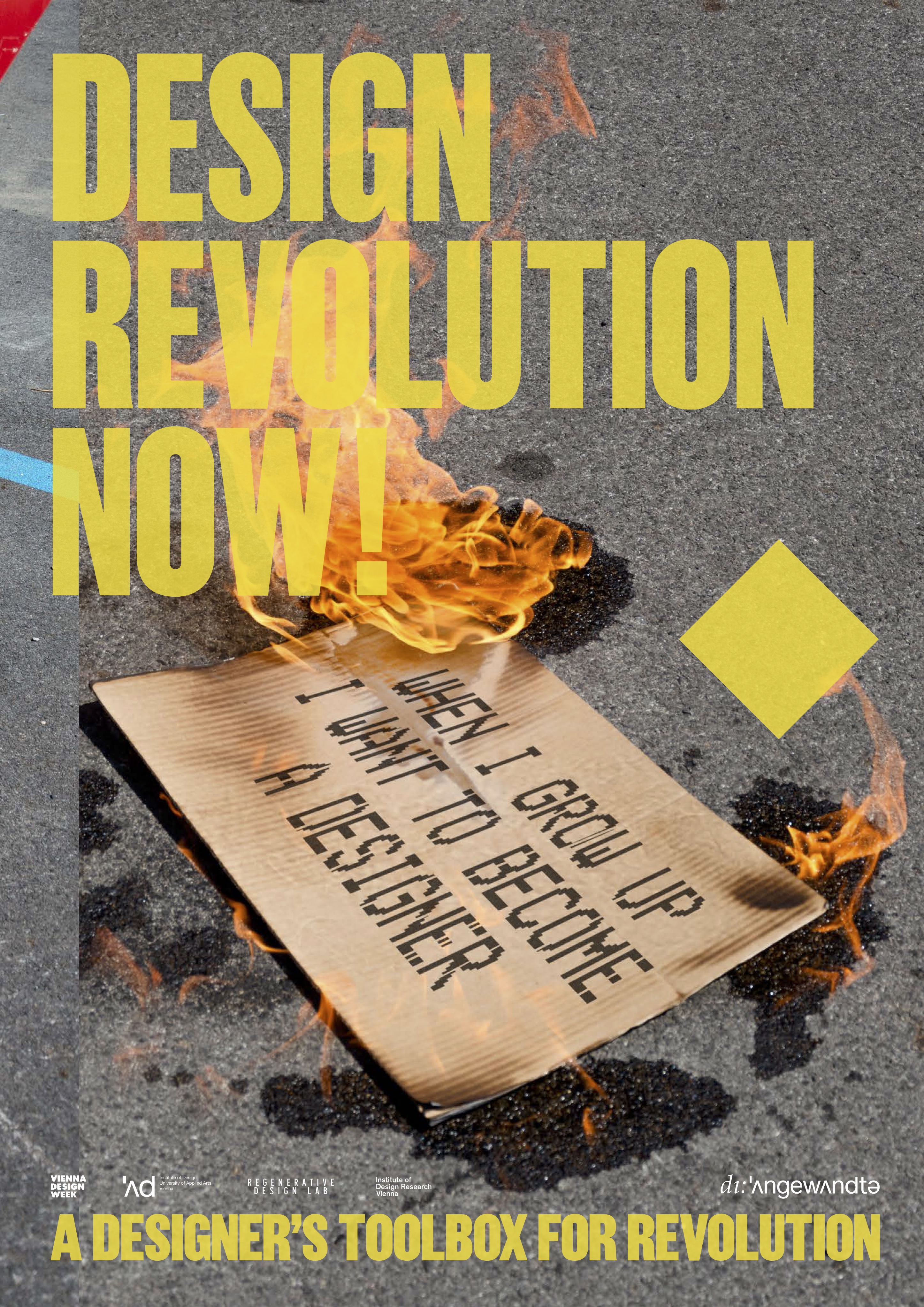Die Ausstellung »Design Revolution Now!« hinterfragt gängige Methoden im Arbeitsprozess von Designer:innen. Auf dreizehn Postern werden u.a. Werkzeuge für die Designrevolution präsentiert, die von einem temporären Kollektiv der Universität für Angewandte Kunst Wien unter der Leitung von Harald Gründl erarbeitet wurden.