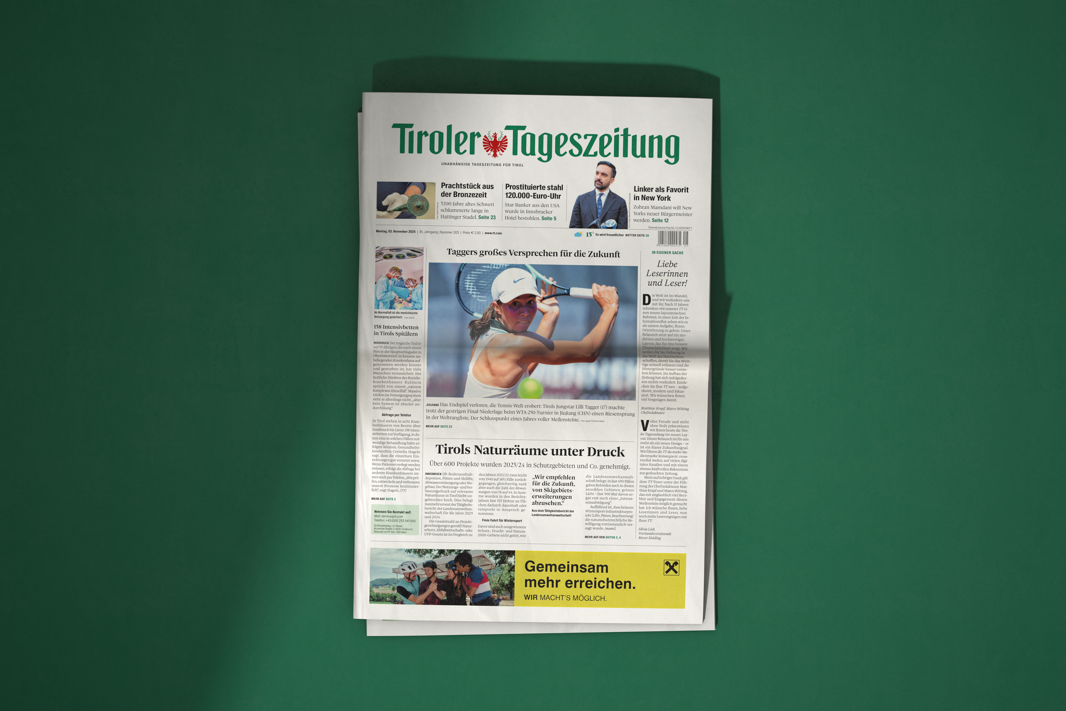 Zum 80-jährigen Jubiläum hat sich die Tiroler Tageszeitung – die auflagenstärkste Tageszeitung Westösterreichs – im November des Vorjahres einen neuen gestalterischen Rahmen geschenkt. »Die Welt ist im Wandel, und wir verändern uns mit ihr«, schrieben die beiden Chefredakteure Matthias Krapf und Marco Witting in der ersten neu gestalteten Ausgabe. »In einer Zeit der Informationsflut sehen wir es als unsere Aufgabe, Ihnen Orientierung zu geben. Unser Relaunch setzt auf ein modernes und hochwertiges Layout, das für eine bessere Übersichtlichkeit sorgt.«